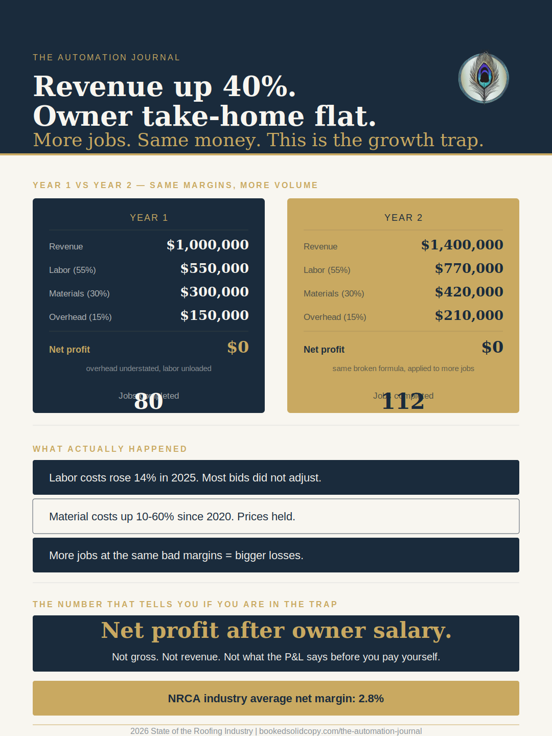The NRCA's 2.8% average net margin is a signal, not a standard. It tells you what most roofing companies end up with when labor is undercosted, overhead is guessed, margin is miscalculated, and cash flow is managed by feel.